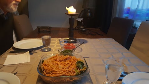 Voor het avondeten vroeg ik mijn vriend om een lekker recept uit te zoeken en hij gaf mij een geschreven receptje waarmee we gingen koken. Let op: in het recept hoort te staan dat je 10 zongedroogde tomaten nodig hebt voor deze hoeveelheid.