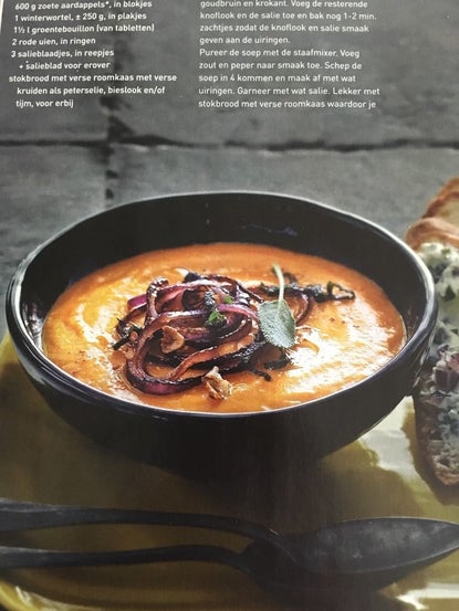 - Zoete aardappel soep (zie onderstaande afbeeldingen), dit recept kwam uit de Delicious